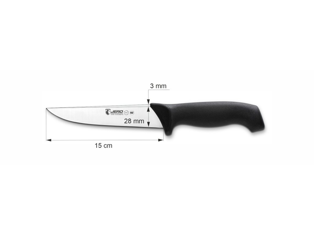 Profesionální kuchyňský nůž JERO má 18 cm dlouhou čepel, výška čepele je u rukojeti 31 mm a horní tloušťka čepele je 3 mm. Rukojeť nože je vyrobena z černého elastomeru.