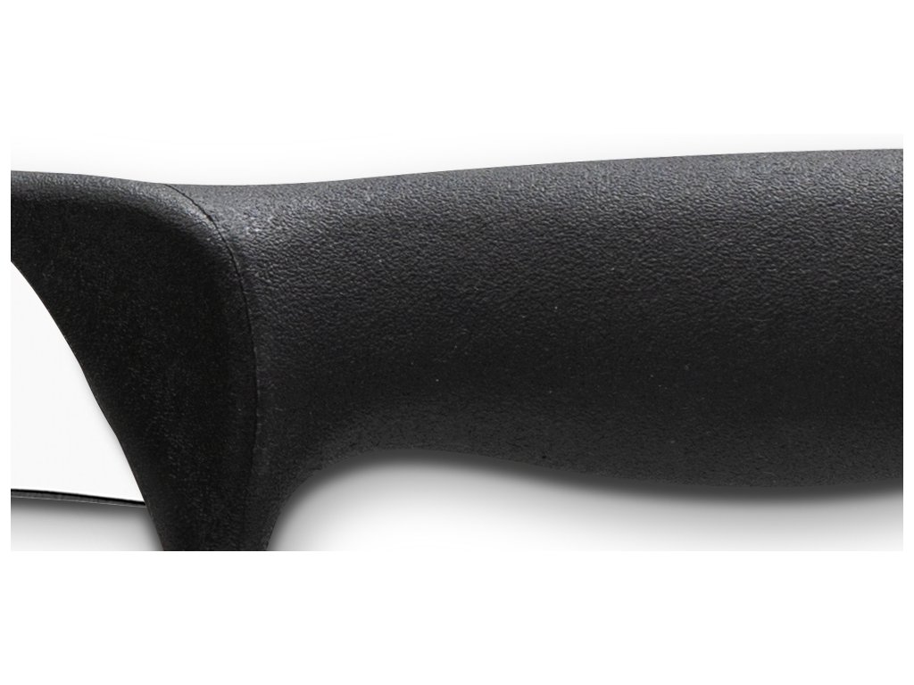 Tento nůž má čepel vyrobenou z vysoce kvalitní molybdenové/vanadové nerezové oceli s výjimečnou řeznou silou, dlouhou životností a vynikající odolností proti korozi. Nerezová ocel 1.4116 X 45 CrMoV 15 je oblíbená především u německých a švýcarských nožů. Je to dobrá volba pro nože, které mají kombinovat ostrost, odolnost a snadnou údržbu. Ergonomická rukojeť nože je vyrobena z měkkého černého elastomeru, který neklouže a umožňuje velmi dobrý úchop i když máte mokrou nebo mastnou ruku. Materiál rukojeti s antibakteriálními vlastnostmi zabraňuje množení mikroorganismů. Nůž můžete umývat v myčce na nádobí.