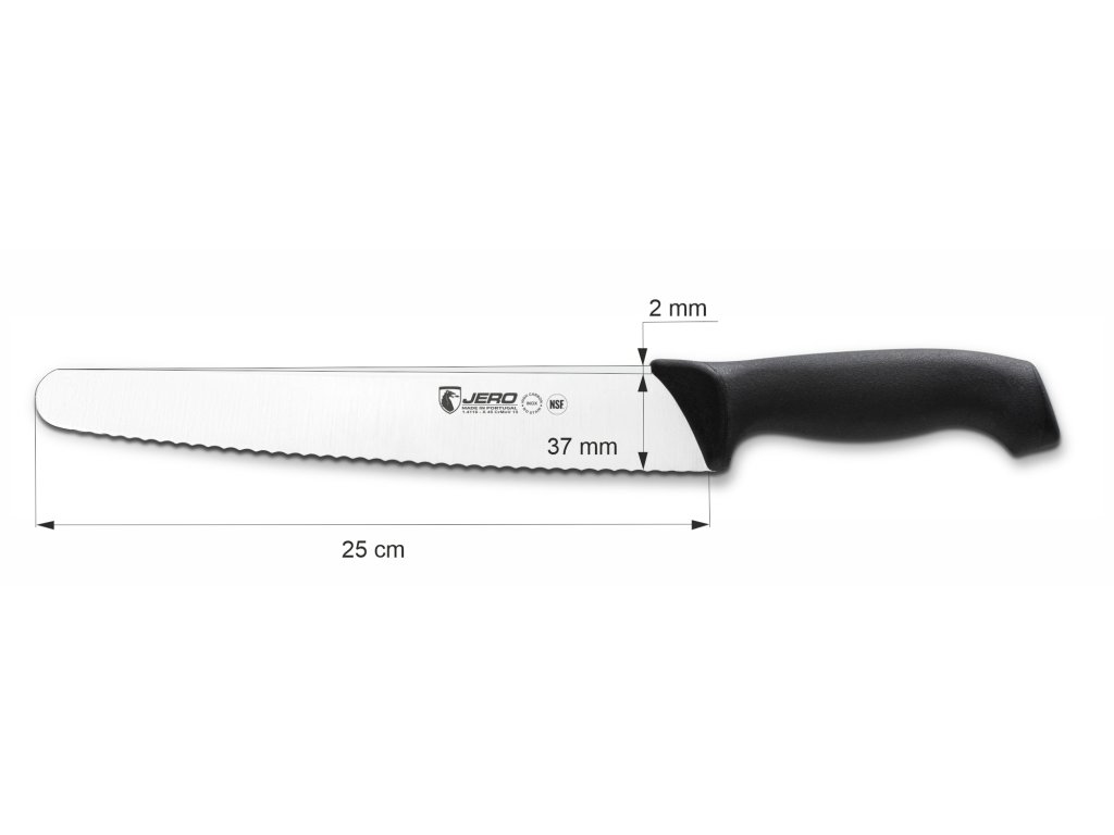 Profesionální kuchyňský nůž JERO má 26 cm dlouhou čepel, výška čepele je u rukojeti 46 mm a horní tloušťka čepele je 3 mm. Rukojeť nože je vyrobena z černého elastomeru.