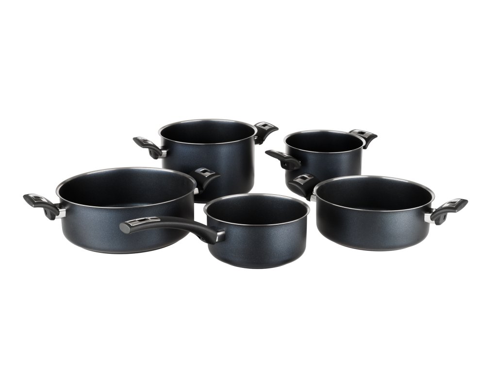 Sada hrnců a rendlíků s elegantním černým nepřilnavým povrchem PROFESSIONAL-R vyztuženým keramickými částicemi prémiového švýcarského výrobce ILAG vydrží zátěž častého a intenzivního používání a vyznačuje se dlouhodobou odolností. Tělo hrnce je robustní a přidaná keramická výztuha povrchu zvyšuje vysokou povrchovou rezistenci.