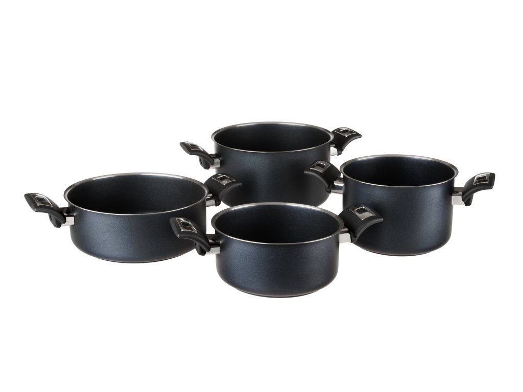 Sada hrnců a rendlíků s elegantním černým nepřilnavým povrchem PROFESSIONAL-R vyztuženým keramickými částicemi prémiového švýcarského výrobce ILAG vydrží zátěž častého a intenzivního používání a vyznačuje se dlouhodobou odolností. Tělo hrnce je robustní a přidaná keramická výztuha povrchu zvyšuje vysokou povrchovou rezistenci.