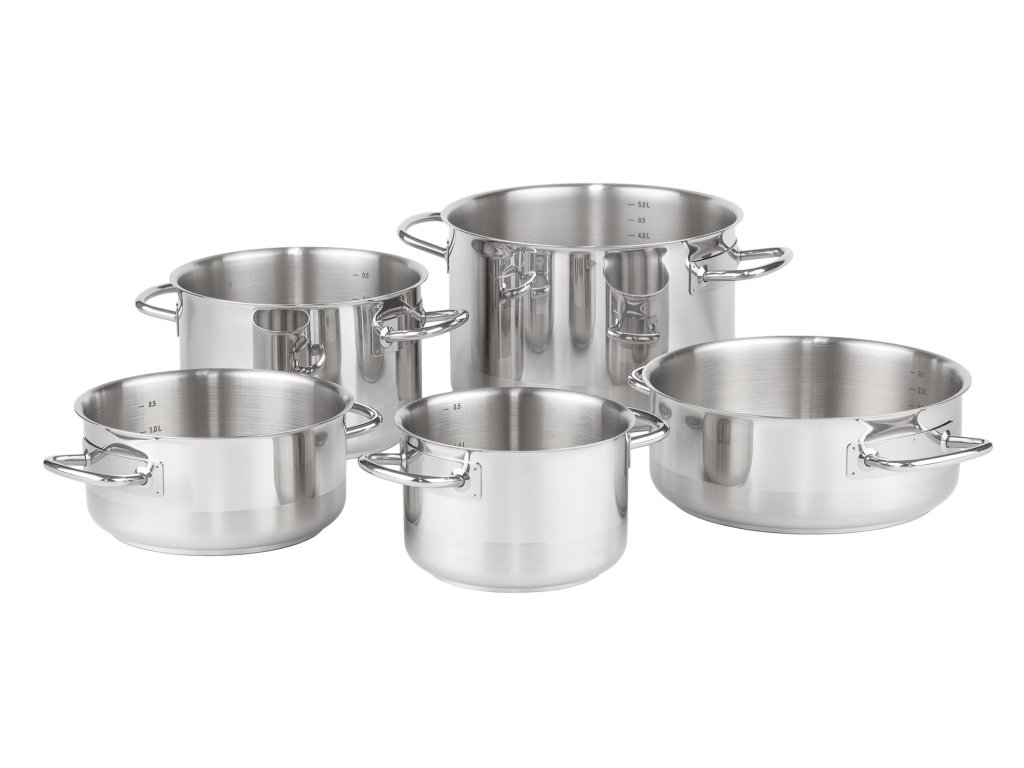 Hrnce a rendlíky této sady mají do ruky padnoucí krásné úchyty a leštěný povrch nádobí doplněný o broušenou spodní část. Předností sady není jen elegantní vzhled, ale i mimořádná kvalita použitého materiálu a dokonalé řemeslné zpracování. Nádobí je vyrobeno z nerezové potravinářské oceli CrNi18/10 pro 100% zdravotní nezávadnost z pevného plechu tloušťky 0,8 mm. Akumulační sendvičové dno A-THERM INDUCTION spoří energii při vaření a po celou dobu životnosti hrnce garantujeme jeho rovinnou stabilitu pro bezztrátový přenos tepla.